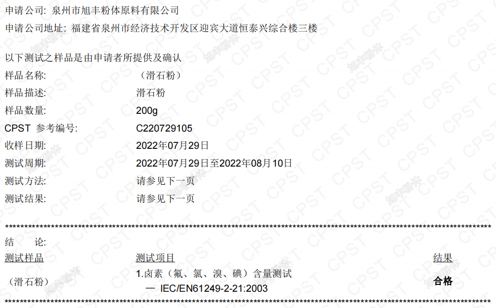 我司已連續多年將自身滑石粉送至第三方檢測機構進行鹵素含量測定,產品各項指標均可滿足標準要求,客戶可放心使用,具體檢測結果見下表。